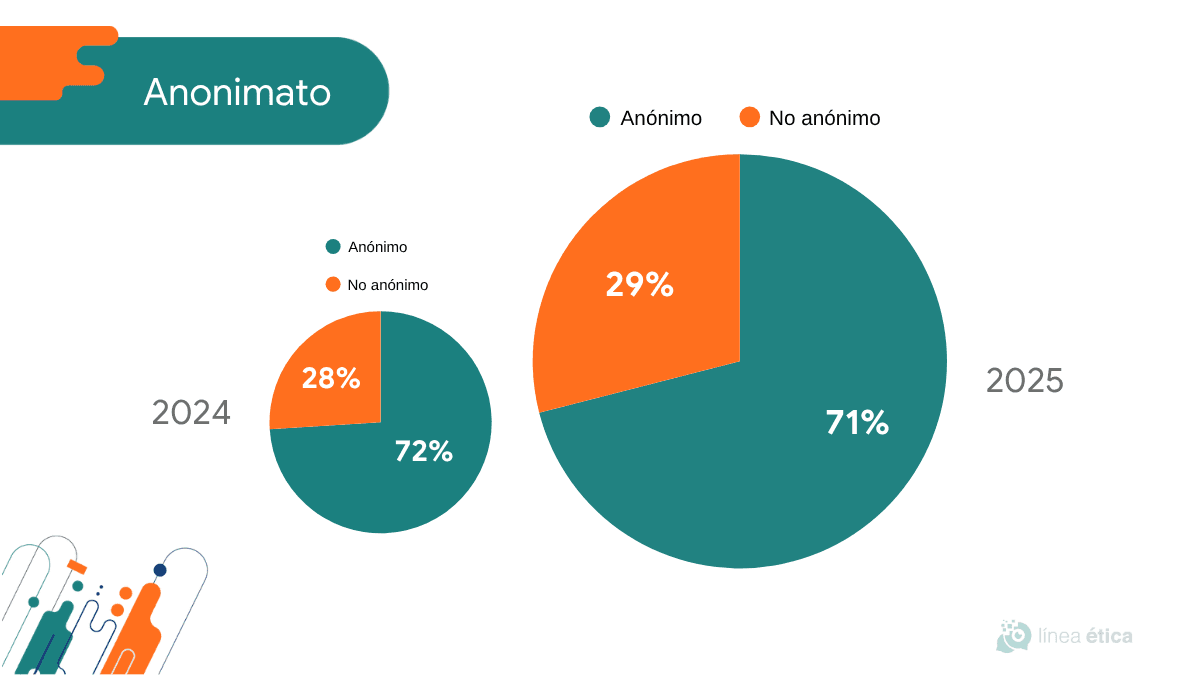 Durante 2025, el 71% de las denuncias fueron realizadas de forma anónima, en línea con el 72% registrado en 2024. Este dato subraya que, para muchas personas, saber que su identidad estará protegida es una condición esencial para atreverse a reportar.